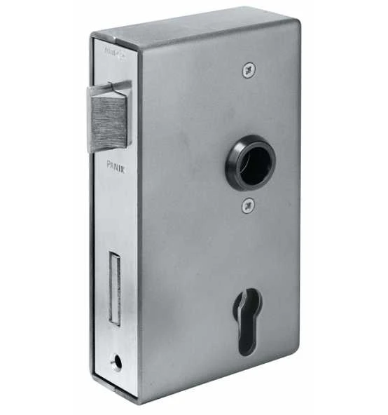 mit verzinktem Antipanikschloss (142PGN) · blank · mit geteilter Nuss 9 mm · vorgerichtet für Profilzylinder · Dornmaß 60 mm · Entfernung 72 mm · 2-tourig · Panik-Durchgangsfunktion D · mit Edelstahlstulp, geschliffen · Zubehör: · 2 Drückerrosetten 18 mm · 4 Schrauben, Edelstahl rostfrei Weitere technische Eigenschaften: · Riegel: Stahl · Maß B: 94,5mm · Maß C: 173mm · Norm: DIN 18250 · Schlosskasten: allseitig geschlossen · Riegelausschluss: 23mm · Falle: Stahl · Maß A: 40mm