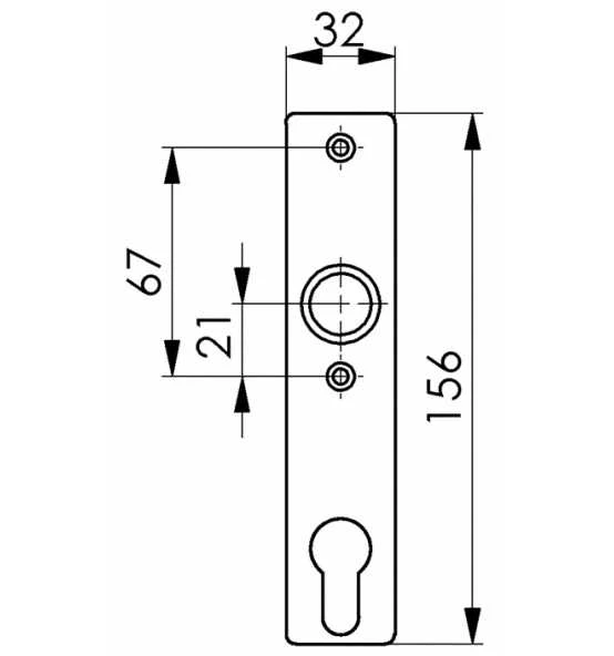 Edelstahl rostfrei · kantige Form · 18 mm Führung · passend für alle Schlosskästen · Edelstahl rostfrei Schrauben werden mitgeliefert · Kurzschild mit 72 mm Entfernung PZ · Schraubenlochabstand 67 mm · Breite 32 mm · Höhe 156 mm · Tiefe 6 mm · inkl. Drückerrosetten für Drücker Ø 16 mm und Ø 18 mm Weitere technische Eigenschaften: · Schraublochabstand: 67mm