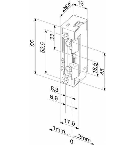 Kompakter Universal-Türöffner, Radiusfalle Fafix 3 mm verstellbar. Symmetrische Bauform, Profix 2 kompatibel. Universalspannung 10 bis 24 AC//DC, dauerbetriebsfest bis 16 V sowie 22 bis 42 V AC/DC, dauerbetriebsfest bis 26 V, steckbarer Anschluss. Flachschließblech: Edelstahl. Minimale Einbaumaße: 25,5 x 16 x 66 mm, rechts und links verwendbar.