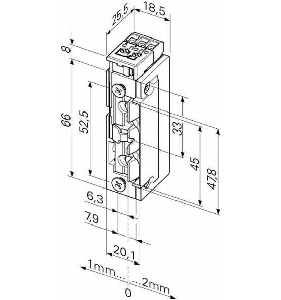 Modell mit bipolarer Schutzdiode · Rückmeldekontakt als potentialfreier Wechselkontakt, der von der Schlossfalle betätigt wird · Radiusfalle · FaFix® 3 mm verstellbar · Universalspannungen, kompatibel zu gängigen Einsteckschlössern · kompatibel zu ProFix® 2 Schließblechen · symmetrische Bauform · DIN links/rechts, sowie waagerecht einsetzbar Weitere technische Eigenschaften: · Aufbruchfestigkeit: 3750N