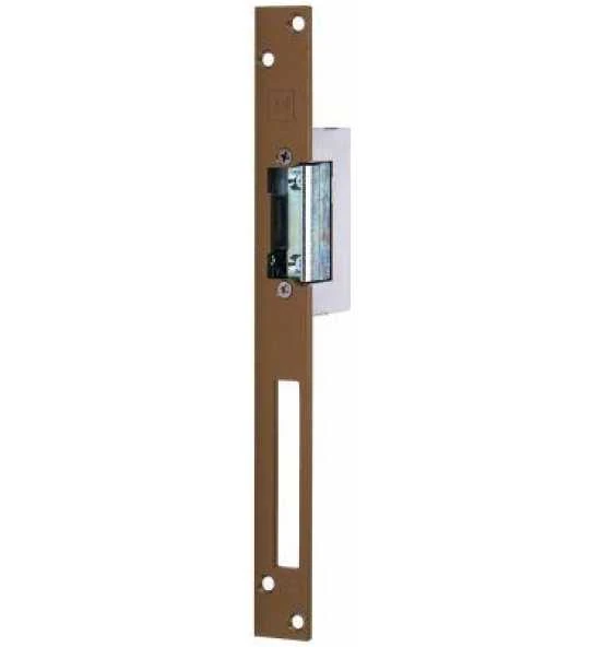 Arbeitsstromausführung, verstell- und fixierbare Falle, Nennspannung: 6-12 Volt GS/WS, für Momentkontakt, Flachschließblech mit Riegelausschnitt, 4 Befestigungsbohrungen, pulverbeschichtet goldfarbig. Maße: Türöffner 75 x 20,5 x 28 mm, Schließblech 250 x 25 x 3 mm, rechts und links verwendbar.