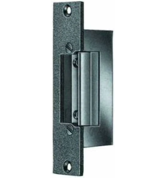 Arbeitsstromausführung, verstell- und fixierbare Falle, Nennspannung: 6-12 Volt GS/WS, für Momentkontakt, Flachschließblech ohne Riegelausschnitt, 2 Befestigungsbohrungen, pulverbeschichtet staubgrau. Maße: Türöffner 75 x 20,5 x 28 mm, Schließblech 110 x 24 x 3 mm, rechts und links verwendbar.