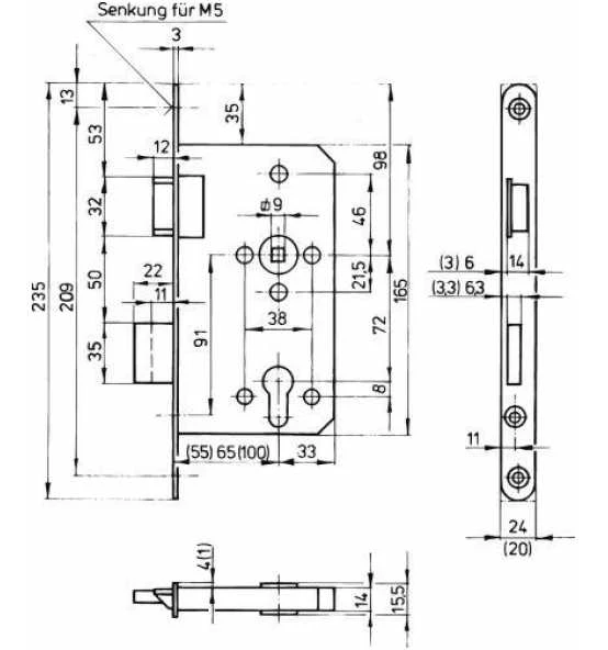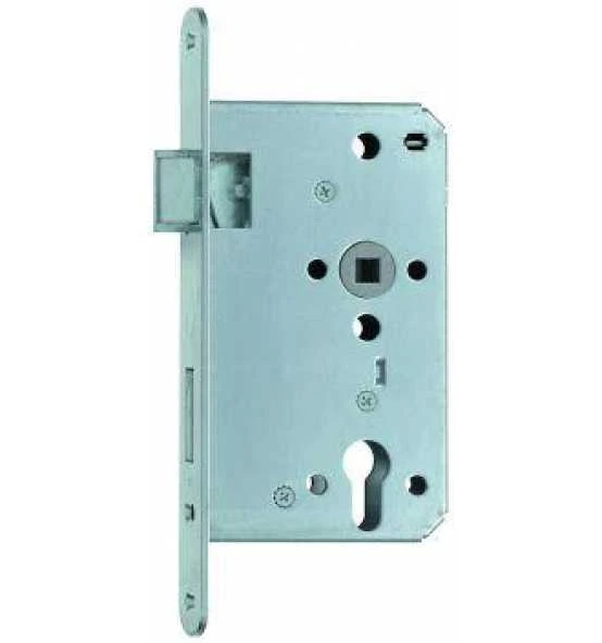 Dornmaß: 65 mm, Entfernung: 72 mm, Nuss: 9 mm, Stulp: 24 mm, rund, verzinkt, Falle und Riegel aus Metall, PZ gelocht, ohne Schließblech.