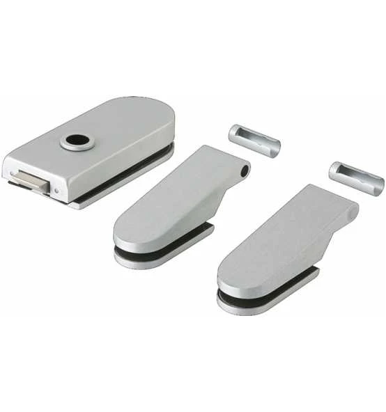 Komplettset mit Schloss, Bändern und Hülsen – ohne Drücker Glastürschloss STUDIO Rondo mit halbkreisförmigem Kappenende, zur Glasmitte zeigend · für 8 mm Glasdicke und 24 mm Falztiefe bzw. für 10 mm Glasdicke und 26 mm Falztiefe · DIN links / rechts verwendbar · Material Aluminium · für ESG 8 bzw. 10 mm · max. Türflügelgewicht: 60 kg / 80 kg (OFFICE Bänder) · Schlosskasten Abmessungen (BxHxT): 159x65x37 mm · Schloss nach DIN 18 251, Klasse 3 (200.000 Betätigungen der Fallenfunktion und 50.000 Betätigungen des Riegels, bei fest montiertem Beschlag nach DIN 18 257 · Einsatzbereich für 1-/2-flügelige Anlagen oder Anlagen mit Seitenteil · mit Drückerführung · ohne Drücker Glastürbänder STUDIO Rondo mit halbkreisförmigem Bandende, zur Glasmitte zeigend · max. 60 kg Flügelgewicht und max. 1000 mm Flügelbreite · Material Aluminium · für ESG 8 mm Glasdicke und 24 mm Falztiefe bzw. für 10 mm Glasdicke und 26 mm Falztiefe · Band Abmessungen (BxH) 131×43 mm · mit Hülse · 2-teilig Weitere technische Eigenschaften: · Glasstärke: 8/10mm · Material: Leichtmetall · Anschlagrichtung: DIN links/rechts · Glasart: ESG · max. Türgewicht: 45kg