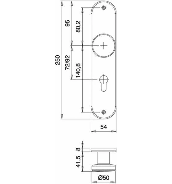 Knopf gerade · sichtbare Verschraubung · Länge 250 mm · Breite 54 mm · Knopf-Ø 50 mm · Lochung PZ · Schildstärke 8 mm · Knopfschilder inkl. Rollenwechselstift Typ O und Holzschrauben 3,5×17 mm / EST 4,5×20 mm · Abweichungen von Standard-TS bitte den entsprechenden Stift gesondert bestellen Weitere technische Eigenschaften: · Schildstärke: 8 mm · Befestigungsart: sichtbare Verschraubung · Ausführung: Knopf gerade · Knopftiefe: 41,5mm