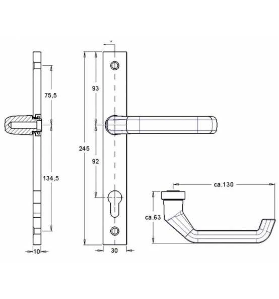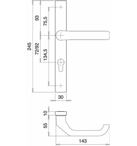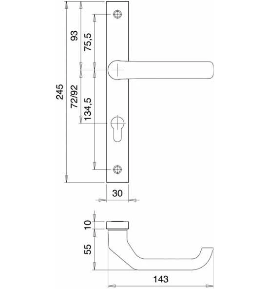 für Rahmentüren · Entfernung 92 mm · Vierkant 8 mm · PZ-gelocht · Drücker fest-drehbar gelagert · massive Schilder · eckig · Stärke 10 mm · Höhe 245 mm · Breite 30 mm · Verschraubung von innen nach außen · innen sichtbar verschraubt · für Türstärke 68-75 mm · DIN links / rechts · Lieferung inkl. Stift und Schrauben Weitere technische Eigenschaften: · Zylinderabdeckung: ohne ZA · Norm: DIN 1906 · Lagerung: fest/drehbar