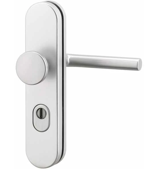 Wechselgarnitur · Lochung PZ · Grundkonstruktion: Druckguss mit 2 mm Teilstahleinlage im Außenschild, oberflächengehärtet · Stärke Innenschild = 8 mm · Stütznocken: M6, Ø 10 mm anbohrgeschützt · Verschraubung: 3-fach M6, verdeckt · Anbohrschutz beim Außenschild · mit Zylinderabdeckung : federnd gelagert für 12 – 17 mm Überstand · DIN links / rechts · Widerstandsklasse ES1 Weitere technische Eigenschaften: · Breite: 54mm · Länge: 250mm · Abdeckung: mit Zylinderabdeckung · Schildstärke: 15 mm · Farb-Nr.: EST