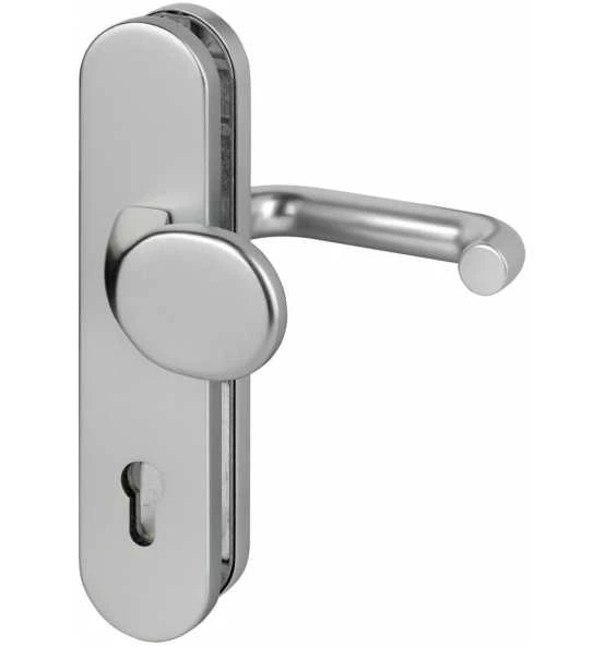Grundkonstruktion: Druckguss mit 2 mm Teilstahleinlage im Außenschild, oberflächengehärtet · Stärke Innenschild = 8 mm · Drücker-Lagerung: lose · Drückertyp und -stärke: 103 mit Ø 22 mm, bzw. bei Alu 8 mm VKT = 104 mit Ø 18 mm · Knopfausführung bei Wechselgarnitur: Modell …/0272 und …/0292 = K2 (gekröpft), bzw. Modell …/0772 und …/0792 = K7 (gerade) · Stütznocken: M6, Ø 10 mm anbohrgeschützt · Verschraubung: 3-fach M6, verdeckt · Anbohrschutz beim Außenschild · Wechselgarnituren mit Spezialrollenwechselstift mit M12-Gewinde · DIN links / rechts · ohne Zylinderabdeckung · Widerstandsklasse ES1 Weitere technische Eigenschaften: · Breite: 54mm · Länge: 250mm · Abdeckung: ohne Zylinderabdeckung · Schildstärke: 12 mm · Farb-Nr.: F1