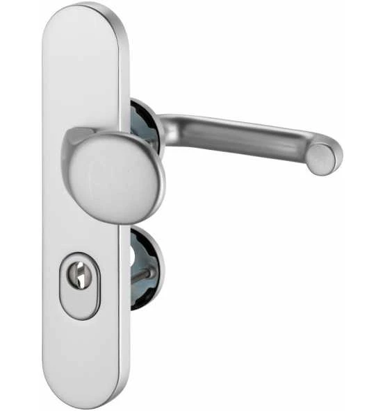 Kombi-Schutzgarnitur mit Rosettenverschraubung · Grundkonstruktion: innen = Stahl, außen = Druckguss, bei Ausführung mit ZA = massives Aluminium · Ausführung Innenrosetten: Ø 55 mm, Stärke 8 mm · Drücker-Lagerung: lose · Drückertyp und -stärke: 103 mit Ø 22 mm · Knopfausführung: K2 (gekröpft) · Stütznocken: M5, Ø 8 mm · Verschraubung: 4-fach M5, verdeckt · Spezialrollenwechselstift mit M12-Gewinde · Modell 8722 = Außenschild mit Anbohrschutz und Zylinderabdeckung: federnd gelagert für 11 – 14 mm Überstand · Entfernung 72 mm · DIN links / rechts · Vierkant 8 mm · Wechselgarnitur Weitere technische Eigenschaften: · Breite: 54mm · Länge: 250mm · Abdeckung: mit Zylinderabdeckung · Schildstärke: 15 mm · Farb-Nr.: F1