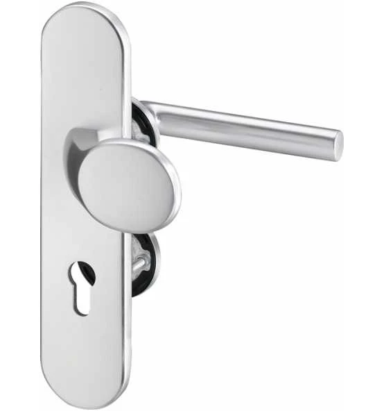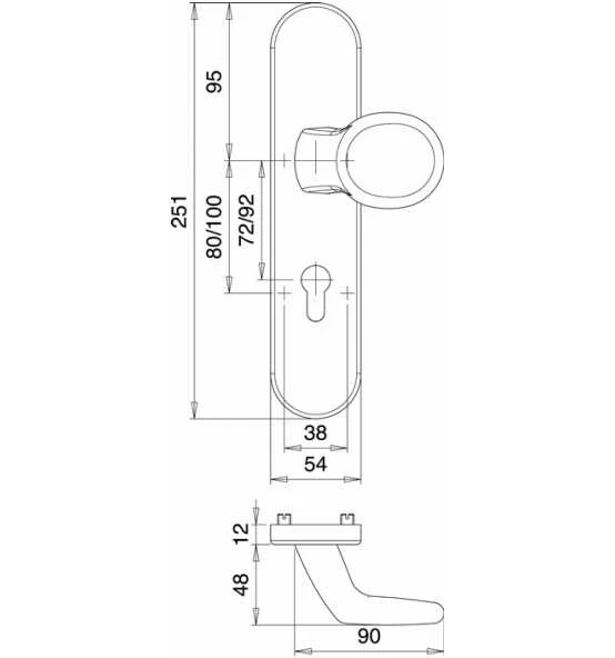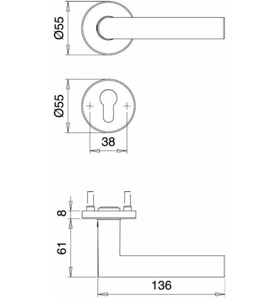 Kombi-Schutzgarnitur mit Rosettenverschraubung · Grundkonstruktion: innen = Stahl, außen = Druckguss, bei Ausführung mit ZA = massives Aluminium · Ausführung Innenrosetten: Ø 55 mm, Stärke 8 mm · Drücker-Lagerung: lose · Drückertyp und -stärke: 108 mit Ø 22 mm · Knopfausführung: K2 (gekröpft) · Stütznocken: M5, Ø 8 mm · Verschraubung: 4-fach M5, verdeckt · Spezialrollenwechselstift mit M12-Gewinde · Modell 8742 = Außenschild mit Anbohrschutz und Zylinderabdeckung: federnd gelagert für 11 – 14 mm Überstand · Entfernung 72 mm · DIN links / rechts · Vierkant 8 mm · Wechselgarnitur Weitere technische Eigenschaften: · Breite: 54mm · Länge: 250mm · Abdeckung: ohne Zylinderabdeckung · Schildstärke: 12 mm · Farb-Nr.: EST