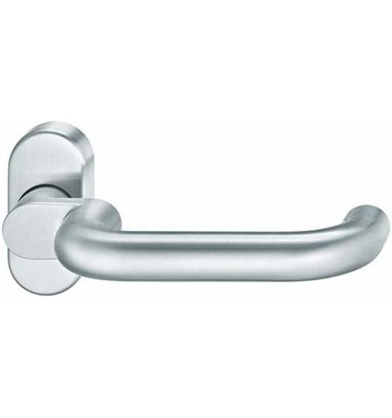 Edelstahl-Türgriff, gekröpft, für Feuer- und Rauchschutzprofiltüren, auf ovaler Rosette, 70 x 32,5 mm,