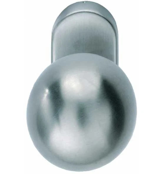 FSB Feuerschutz-Profiltür-Kugelknopf gerade, auf ovaler Rosette mit unsichtbarer Befestigung für Senkschrauben M5 (Schraublochabstand 50 mm) mit Hochhaltefeder · mit 9 mm für Feuer- und Rauchschutztüren, fest/drehbar gelagert · DIN links/rechts Lieferung ohne Stift und Schrauben Weitere technische Eigenschaften: · Befestigungssystem: verdeckte Verschraubung · Anschlagrichtung: DIN links / rechts · Farb-Nr.: 6204 · Knopfdurchmesser: 50mm