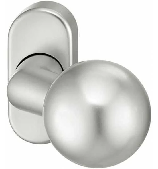 Edelstahl-Türknopf, rund, auf ovaler Rosette, 70 x 32,5 mm, mit Hochhaltemechanismus, nicht sichtbare Befestigung.
