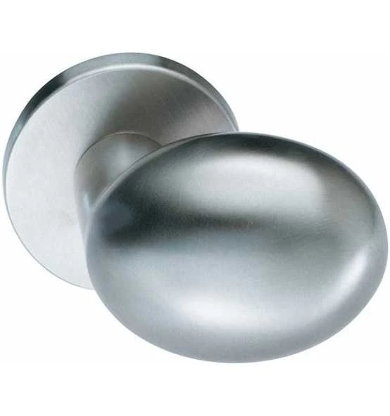 Edelstahl-Türknopf, oval, auf runder Rosette, Ø 55 mm, Schraublochabstand 38 mm, nicht sichtbare Befestigung.