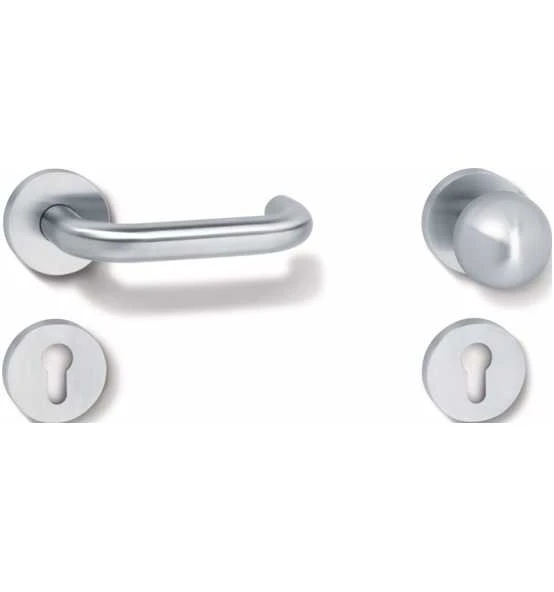 Wechselgarnitur 111XAH13.139 in H-Technik mit Rosetten nach DIN 18255 und DIN EN 1906 · aus Edelstahl · bestehend aus: Knopf Modell 109X aus Edelstahl und Türdrücker Modell 111X… aus Edelstahlrundrohr (1.4301) · Durchmesser 21,3 mm mit 1,5 mm Wandstärke · mit Ansatzführung und Rastnut · mit Gewindestift M5 als zusätzliche Fixierung der Türdrücker mit dem Vierkantstift zur optimalen Kraftübertragung in das Türblatt · der Drücker erfüllt die Vorgaben der DIN EN 179 und DIN 18040 · Montage durch einfaches Einrasten der Türdrücker in die auf der Tür vormontierten Unterteile · die Rastung kann mittels Demontageschlüssel wieder gelöst werden · Rosetten 305.21X… und 306.23X… · Unterkonstruktion 305.21X… in Kunststoff-Stahlverbundbau mit schwarzer Zink/Nickel-Oberfläche für optimalen Korrosionsschutz · integriertes Hochhaltemodul mit Federunterstützung – DIN links und DIN rechts verwendbar – zur Unterstützung des Schlosses für eine längere Lebensdauer · Festdrehbarlagerung der Drücker mit selbsttätig einrastender Rundumverriegelung und 5 mm Lagerstelle als wartungsfreies Gleitlager mit elastischem Ausgleichsbereich zum Aufheben möglicher Montageungenauigkeiten · verdeckte, lockerungssichere Verschraubung mit M5 Edelstahlschrauben- und Hülsenschraubenkombination sowie in das Türblatt eintauchenden Stützzapfen · Rosetten-Abdeck-Kappe, rund, aus Edelstahl (1.4301), Durchmesser 55 mm, 10,5 mm hoch, 1,5 mm Wandstärke · Oberfläche matt geschliffen · ausgelegt und geprüft für den Objektbereich · Gebrauchskategorie nach DIN EN 1906 – Klasse 4 Feuerschutzgarnitur mit Vierkantstift 9 mm · nach DIN 18273 Weitere technische Eigenschaften: · Ergänzung: D/K · Norm: DIN 18273 · Lagerung: fest – fest/drehbar · Vierkant: 9mm