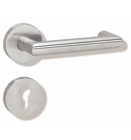 in H-Technik nach DIN 18255 und DIN EN 1906 · aus Edelstahl · Oberfläche matt geschliffen · bestehend aus: Türdrücker 165XAH, Durchmesser 21,3 mm, Rundrosetten 305.21XAH und 306.23XA · mit integriertem Hochhaltemodul mit Federunterstützung · der Drücker erfüllt die Vorgaben der DIN EN 179 · Gebrauchskategorie: Klasse 4 Garnitur mit Vierkantstift 8 – 8,5 mm · Ausführungsvorschlag! Bitte alle Maße und baulichen Gegebenheiten im Auftragsfall prüfen! Weitere technische Eigenschaften: · Drückerlänge: 140mm · Befestigungssystem: verdeckte Verschraubung · Drückertiefe: 62mm · Nockenabstand: 38mm · Farb-Nr.: XA · Norm: DIN 1906