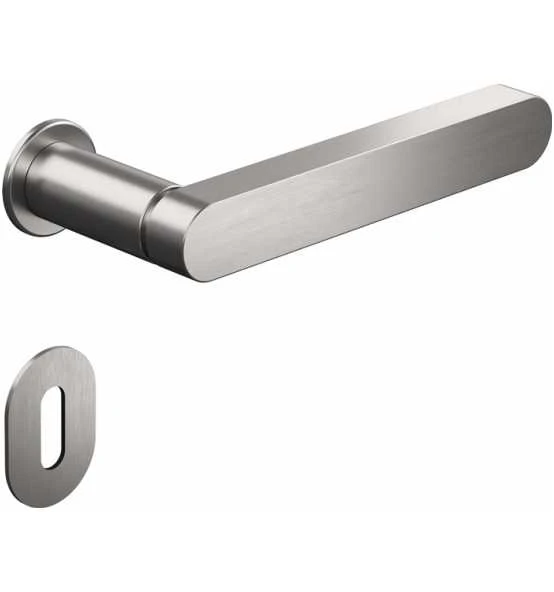 Zimmergarnitur mit Schlüsselrosetten · mit flacher Drückerrosette, Abdeck-Kappe aus Edelstahl, Türdrücker Modell 271XAM in L-Form aus Edelstahl (1.4301), Vierkantstift 8 mm, für Österreich 8,5 mm, mit Trapezgewinde · Fixierung der Drücker in einem Einpresslager und einer Polyamid-Gleitlagerbuchse · mit Schlüsselrosette 306XAM, 32 x 47 mm · Montage der Einpressbuchsen mittels Montagemutter mit Trapezgewinde, SW 19, mit einem Ringschlüssel SW 19 · die Montage wird empfohlen an stumpfen wie auch gefälzten Wohnraum- und Innentüren mit HDF-Deckplatte und Mittellagen aus Röhrenspan- bzw. Vollspaneinlage oder hochwertiger Weitere technische Eigenschaften: · Farb-Nr.: XA