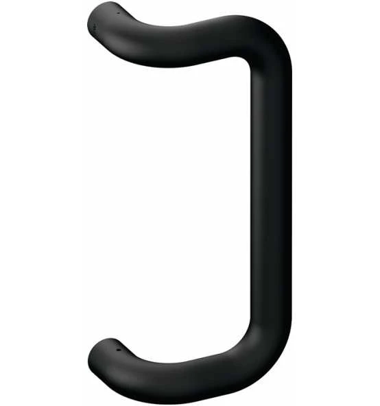 Stoßgriff System 111 · Winkelgriff in gebogener Form ausgeführt, mit gerader Anbindung · zur Montage vorgerichtet für Blatt-Türen · Achsmaß 300 mm · aus durchgefärbtem, mattem Polyamid · Durchmesser 33 mm · für einseitige und paarweise Befestigung · Ausführungsvorschlag! Bitte alle Maße und baulichen Gegebenheiten im Auftragsfall prüfen! Weitere technische Eigenschaften: · Breite: 145mm · Farb-Nr.: 90m
