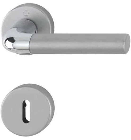 HOPPE-Aluminium-Rosetten-Türgriff-Garnitur mit Schlüsselrosetten für Innentüren, geprüft nach DIN EN 1906: 37-0140A, Objekt-Garnitur, Türgriffe mit HOPPE-Schnellstift-Verbindung (mit HOPPE-Vollstift), Rosetten mit Kunststoff-Unterkonstruktion, Rückholfeder und Stütznocken, verdeckte, durchgehende Verschraubung mit selbstschneidenden Gewindeschrauben.