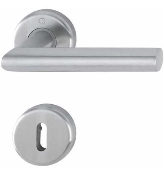 HOPPE-Edelstahl-Innentür-Rosetten-Garnitur (Türgriff-Garnitur): Türgriffe mit HOPPE-Profilstift-Verbindung, Rosetten mit Kunststoff-Unterkonstruktion und Stütznocken, verdeckte, durchgehende Verschraubung mit selbstschneidenden Gewindeschrauben.