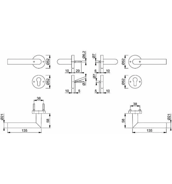 Aluminium-Feuerschutz-Rosetten-Türgriff-Garnitur mit PZ Schlüsselrosetten für Innentüren · geprüft nach DIN 18273 und DIN EN 1906: 47-D1150A und PIVCERTPlus (1.000.000 Prüfzyklen) · Objekt-Garnitur, Lagerung: Türgriffe fest/drehbar · Rückholfedern · HOPPE-Steckgriff-Verbindung mit Kugel-Arretierung Sertos® · wartungsfreie Gleitlager · Verbindung: HOPPE-Profilvollstift 9 mm · Unterkonstruktion: Stahl · Stütznocken · Befestigung: verdeckt, durchgehend, Gewindeschrauben M4 · Besonderheit: Türgriffe mit Stahlkernen · für Türstärke 45-65 mm · Lochung PZ · DIN links / rechts verwendbar · Drückergarnitur Weitere technische Eigenschaften: · Ergänzung: D/D · Norm: DIN 18273 · Lagerung: fest-drehbar-gelagert · Vierkant: 9mm