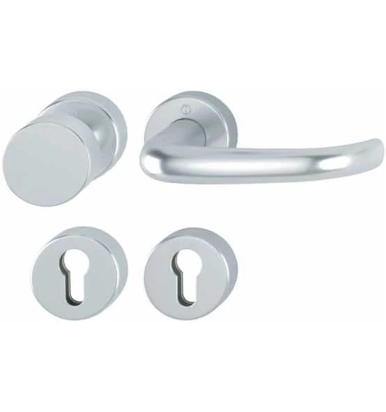 Aluminium-Feuerschutz-Rosetten-Wechsel-Garnitur mit PZ Schlüsselrosetten für Wohnungsabschluss-Türen · geprüft nach DIN 18273, mitgeprüft in Notausgangsverschlüssen nach DIN EN 179 , und DIN EN 1906: 47-D1150A und PIVCERTPlus (1.000.000 Prüfzyklen) · Objekt-Garnitur · Lagerung: außen Knopf fest, innen Türgriff fest/drehbar · Rückholfeder · HOPPE-Steckgriff-Verbindung mit Kugel-Arretierung Sertos® · wartungsfreies Gleitlager · Verbindung: HOPPE-FDW-Profilvollstift 9 mm · Unterkonstruktion: Stahl · Stütznocken · Befestigung: verdeckt, durchgehend, Gewindeschrauben M4 · Besonderheit: Türgriff mit Stahlkern · Lochung PZ · DIN links / rechts verwendbar · Wechselgarnitur Weitere technische Eigenschaften: · Ergänzung: D/K · Norm: DIN 18273 · Lagerung: fest-drehbar-gelagert · Vierkant: 9mm