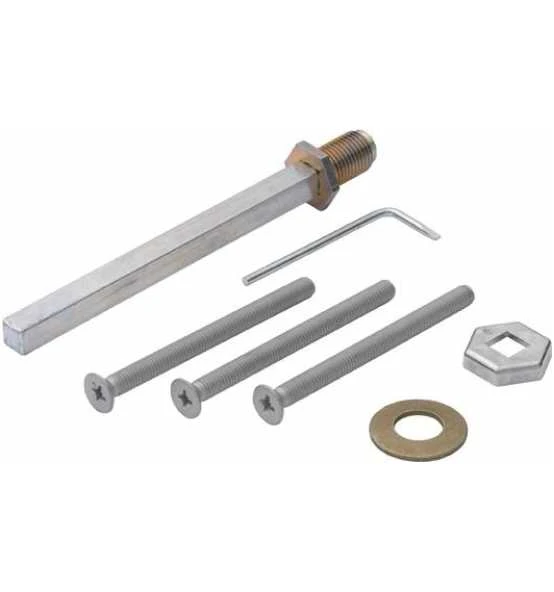 Aus Eisen, 8 mm HOPPE-FDW-Vollstift (bei 10 mm abgesetzer FDW-Vollstift 10 mm auf 8 mm), Unterlegscheibe, Gewindeschrauben M6 nach DIN 965 10.9 mit Kreuzschlitz-Senkkopf, Montage-Hülse, Demontage-Schlüssel, für Schutz-Wechsel-Garnituren, außen mit Knopf 61G, (E/M)86G ES1 (SK2) aus Aluminium, Edelstahl und Messing mit HOPPE-Schnellstift-Verbindung und verdeckter Verschraubung bzw. mit den Innenschildern (E/M)3310 und 2210.