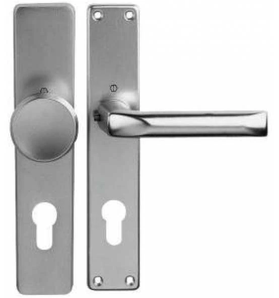 HOPPE-Aluminium-Innentür-Langschild-Wechsel-Garnitur; außen: Knopf fest auf Schild, Schild nicht sichtbar verschraubt; innen: loser Türgriff, Schild sichtbar verschraubt.