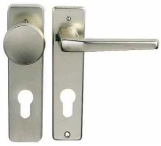 HOPPE-Aluminium-Innentür-Kurzschild-Wechsel-Garnitur; außen: Knopf fest auf Schild, Schild nicht sichtbar verschraubt; innen: loser Türgriff, Schild sichtbar verschraubt (mit Anschlagplatte).