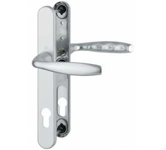 HOPPE-Aluminium-Profiltür-Langschild-Garnitur (Türgriff-Garnitur): Türgriffe fest/drehbar gelagert, HOPPE-Vollstift-Verbindung, Schilder mit Edelstahl-Unterkonstruktion und Stütznocken; innen: sichtbare Verschraubung M6.