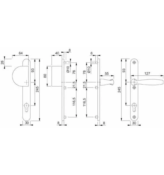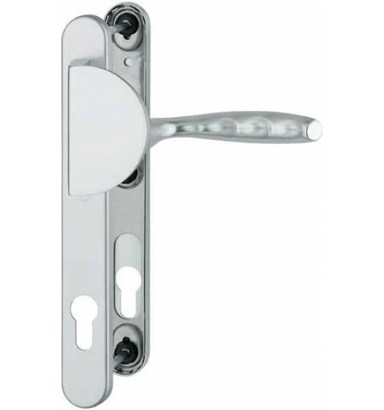 HOPPE-Aluminium-Profiltür-Langschild-Garnitur (Türgriff-Garnitur): Türgriffe fest/drehbar gelagert, HOPPE-Vollstift-Verbindung, Schilder mit Edelstahl-Unterkonstruktion und Stütznocken; innen: sichtbare Verschraubung M6. Mit Griffplatte.