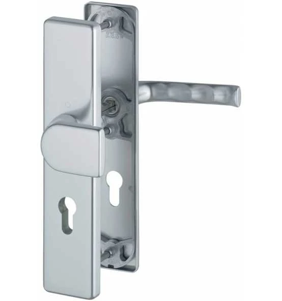 für Abschlusstüren · Zamak-Unterkonstruktion im Außen- und Innenschild · mit feststehendem Knopf · FDW-Profilstift-Verbindung · sichtbare Verschraubung · Lochung PZ · Außenschild-Randhöhe 12 mm · Aluminium · Randhöhe Schild: 12 mm · DIN links / rechts · Wechselgarnitur · Widerstandsklasse ES 0 Weitere technische Eigenschaften: · Breite: 54mm · Länge: 250mm · Abdeckung: ohne Zylinderabdeckung · Schildstärke: 12 mm · Farb-Nr.: F4
