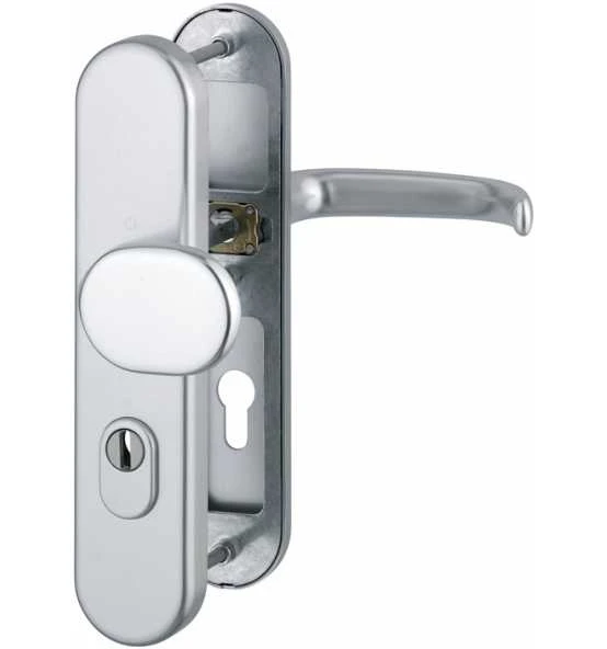 für Abschlusstüren · Stahl-Unterkonstruktion um Außen- und Zamak-Unterkonstruktion im Innenschild · außen: gekröpfter, feststehender Knopf · mit Rückholfeder · innen: loser Türgriff · Schnellstift-Verbindung (mit Hoppe FDW-Vollstift) · Zylinderabdeckung aus gehärtetem Stahl für vorstehende Zylinderlänge 10 – 18 mm · verdeckt, durchgehende Verschraubung · Lochung PZ · DIN links / rechts · Widerstandsklasse ES 1 Weitere technische Eigenschaften: · Breite: 54mm · Länge: 250mm · Abdeckung: mit Zylinderabdeckung · Schildstärke: 15 mm · Farb-Nr.: F1