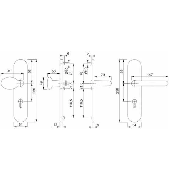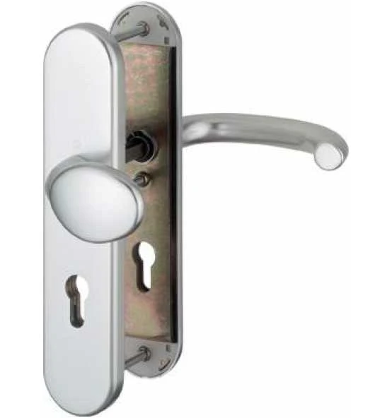 HOPPE-Aluminium-Feuerschutz-Schutzbeschlag (Wechsel-Garnitur)FES1 (SK2): geprüft nach DIN 18257, DIN 18273 und mitgeprüft in Notausgangsverschlüssen nach DIN EN 179, Stahl-Unterkonstruktion im Außen- und Innenschild; außen: gekröpfter, feststehender Knopf; hochfeste, verdeckte Verschraubung; innen: Türgriff fest/drehbar gelagert im wartungsfreien Gleitlager der Stahl-Unterkonstruktion, HOPPE-FDW-Profilvollstift-Verbindung mit Klemmfeder zum Toleranzausgleich in der Schlossnuss, hochfeste, verdeckte Verschraubung.