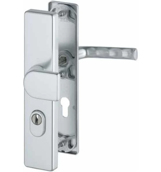 HOPPE-Aluminium-Schutzbeschlag (Wechsel-Garnitur) ES1 (SK2): geprüft nach DIN 18257, Stahl-Unterkonstruktion im Außen- und Zamak-Unterkonstruktion im Innenschild; außen: gekröpfter, feststehender Knopf (ummontierbar), Zylinder-Abdeckung aus gehärtetem Stahl für vorstehende Zylinderlänge 10-18 mm; innen: loser Türgriff, HOPPE-Schnellstift-Verbindung (mit HOPPE-FDW-Vollstift, abgesetzter Stift bei Variante 10 mm), hochfeste, sichtbare Verschraubung. Die Stärke der Innenschilder wurde von 8 mm auf 10 mm geändert, eine neue Maßzeichnung liegt nicht vor.