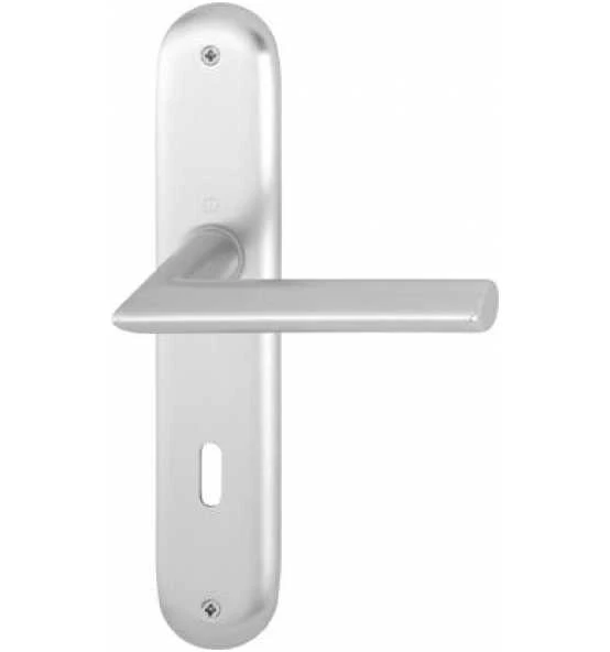HOPPE-Aluminium-Innentür-Langschild-Garnitur (Türgriff-Garnitur): geprüft nach DIN EN 1906 (Benutzungs-Kategorie 3), Türgriffe mit HOPPE-Schnellstift-Verbindung (mit HOPPE-Vollstift) und Rückholfeder, Schilder sichtbar verschraubt.