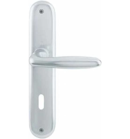 HOPPE-Aluminium-Innentür-Langschild-Garnitur (Türgriff-Garnitur): geprüft nach DIN EN 1906 (Benutzungs-Kategorie 3), Türgriffe mit HOPPE-Schnellstift-Verbindung (mit HOPPE-Vollstift) und Rückholfeder, Schilder sichtbar verschraubt.