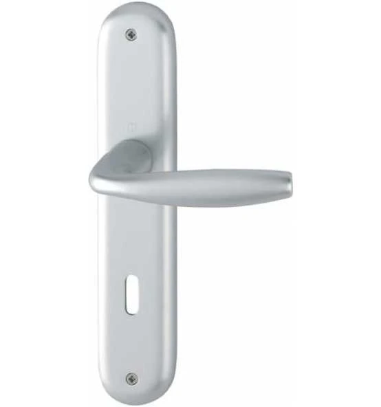 HOPPE-Aluminium-Innentür-Langschild-Garnitur (Türgriff-Garnitur): geprüft nach DIN EN 1906 (Benutzungs-Kategorie 3), Türgriffe mit HOPPE-Schnellstift-Verbindung (mit HOPPE-Vollstift) und Rückholfeder, Schilder sichtbar verschraubt.
