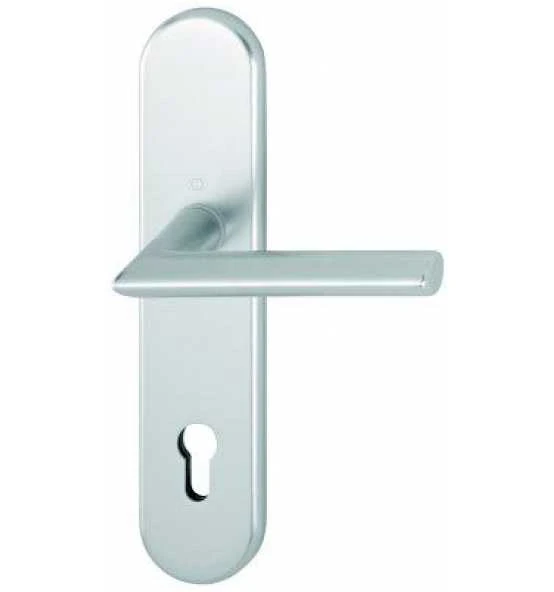 HOPPE-Aluminium-Innentür-Langschild-Garnitur (Türgriff-Garnitur): geprüft nach DIN EN 1906 (Benutzungs-Kategorie 3), Türgriffe mit HOPPE-Schnellstift-Verbindung (mit HOPPE-Vollstift) und Rückholfeder, Schilder sichtbar verschraubt.