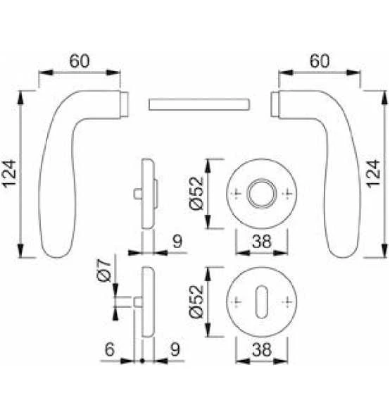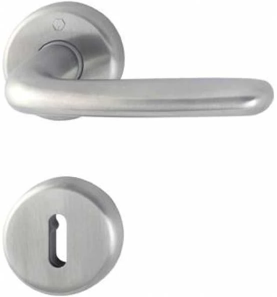 HOPPE-Edelstahl-Innentür-Rosetten-Garnitur (Türgriff-Garnitur): Türgriffe mit HOPPE-Profilstift-Verbindung, Rosetten mit Kunststoff-Unterkonstruktion, Rückholfeder und Stütznocken, verdeckte, durchgehende Verschraubung mit selbstschneidenden Gewindeschrauben.