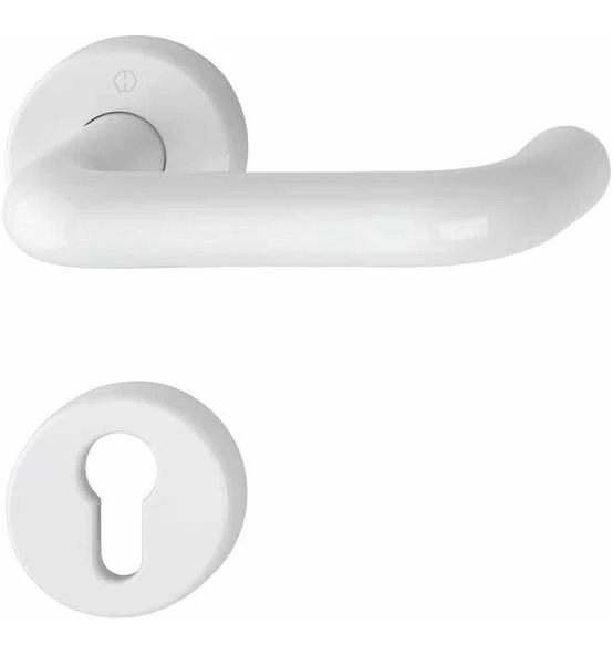 HOPPE-Kunststoff-Innentür-Rosetten-Garnitur (Türgriff-Garnitur): Türgriffe fest/drehbar gelagert mit HOPPE-Vollvierkantstift-Verbindung, Rosetten mit Kunststoff-Unterkonstruktion und Stütznocken; verdeckte, durchgehende Verschraubung mit selbstschneidenden Gewindeschrauben.