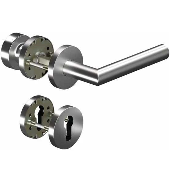 Feuerschutz-Rosetten-Garnitur · DIN links / rechts · Vierkant 9 mm · Drückergarnitur = beidseitig Drücker / Wechselgarnitur = außen Knopf 3020 · für Türstärke 38-63 mm Lieferung als Komplettgarnitur Weitere technische Eigenschaften: · Ergänzung: D/K · Lagerung: fest / fest-drehbar · Vierkant: 9mm
