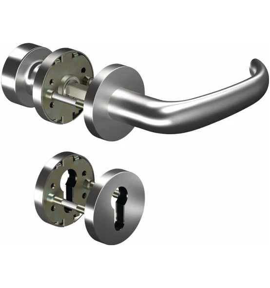 Feuerschutz-Rosetten-Garnitur · DIN links / rechts · Vierkant 9 mm · Drückergarnitur = beidseitig Drücker / Wechselgarnitur = außen Knopf 3020 · für Türstärke 38-63 mm Lieferung als Komplettgarnitur Weitere technische Eigenschaften: · Ergänzung: D/K · Norm: EN 179 · Lagerung: fest / fest-drehbar · Vierkant: 9mm